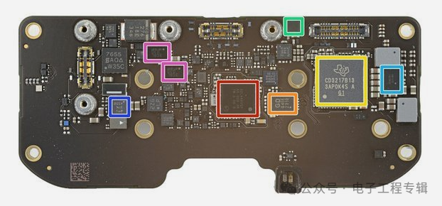 芯片方面,在Vision Pro主机及配套的扬声器及外接电源当中,除了苹果的自研的处理器芯片之外,还有多颗苹果自研的电源管理芯片,以及大量的德州仪器的芯片,数量达到了17颗之多。令人意外的是,Vision Pro上还有一颗国产存储芯片厂商兆易创新的NorFlash芯片。